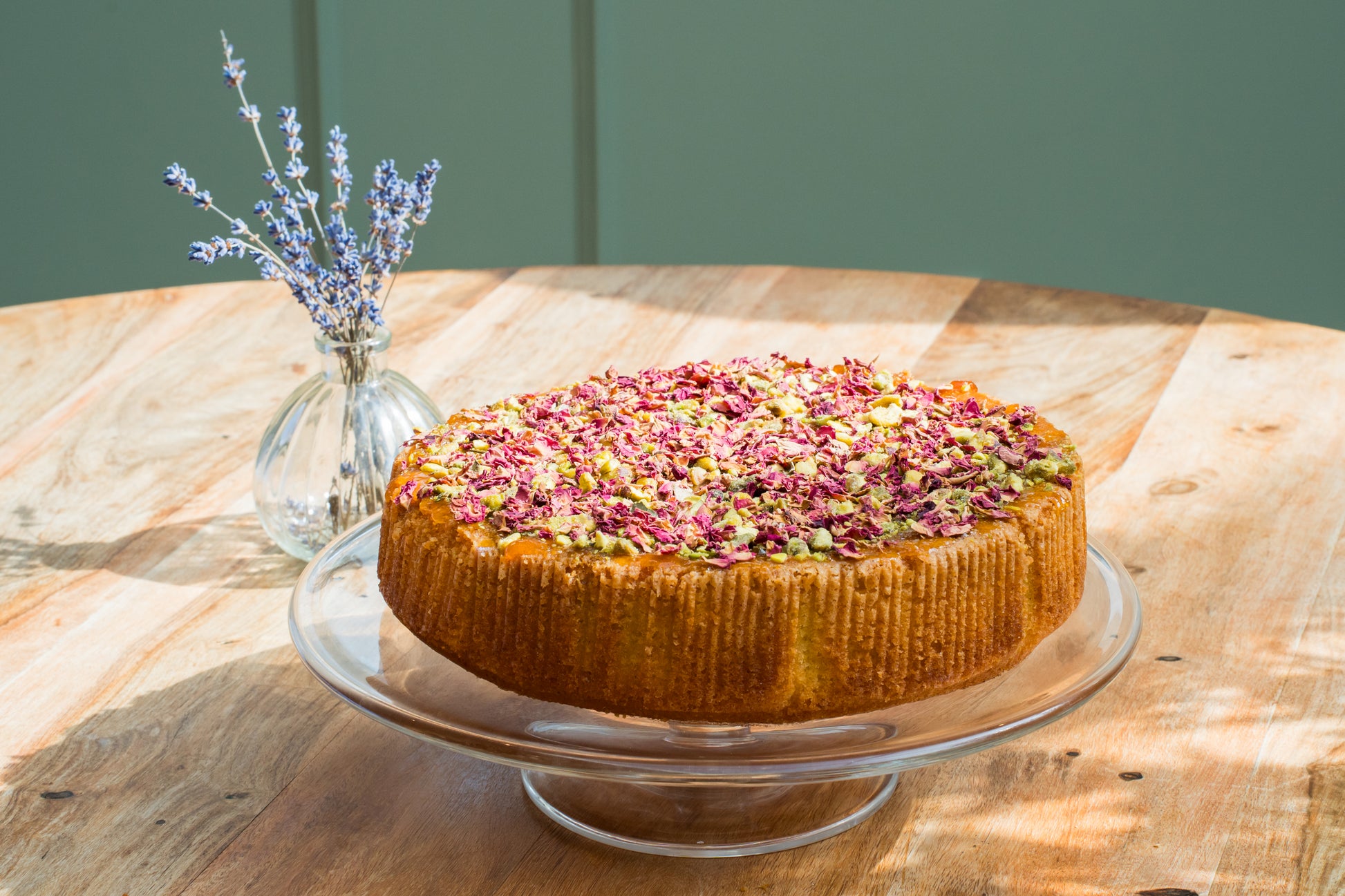 Delicately fragrant and beautifully indulgent, our Honey Rose Pistachio Cake is a truly elegant creation. Soft, moist sponge is infused with subtle notes of floral rose and natural honey sweetness, layered with smooth, creamy frosting and finished with a generous sprinkle of finely chopped pistachios.